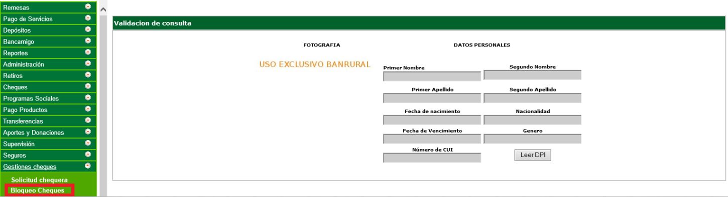2. En el menú principal ahora se encuentra disponible la opción "Gestiones Cheques", seleccionar la opción "Bloqueo de cheque", visualizará la validación de datos del cliente de Banrural la cual podrá realizar con la lectura del DPI ó ingresar manualmente el número de documento si este tuviera defectos en el plástico y problemas con el lector de huella