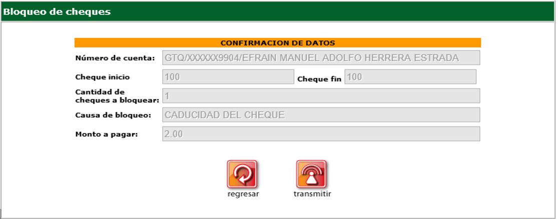4. El sistema mostrará la información ingresada para confirmar los datos brindados por el cliente para el bloqueo de cheque, de existir errores en los datos ingresados debe regresar a la pantalla anterior, si los datos fueron ingresados correctamente seleccionar "transmitir".