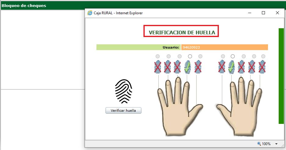 • Validación de la solicitud de bloqueo de cheque por medio de la huella del cliente.