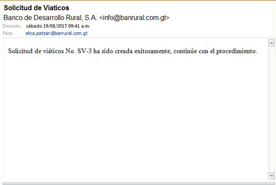 15. Te llegará un correo electrónico con el siguiente mensaje: "Solicitud de viáticos No. SV-3 ha sido creada exitosamente, continúe con el procedimiento".