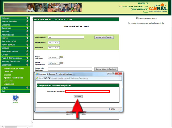 8. Se mostrará la pantalla "Busqueda de Gerente Regional", en la casilla "Nombre de Gerente" ingresa la inicial o nombre completo del Gerente Regional y haz clic en el botón "Buscar".