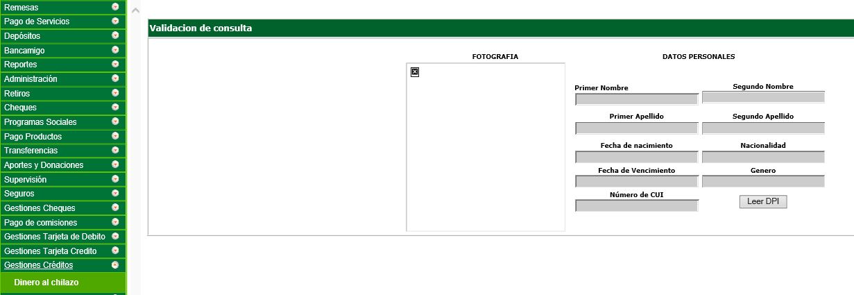 2. En el menú principal se encuentra disponible la opción "Gestiones Créditos", seleccionar la opción "Dinero al chilazo" validar los datos del cliente en la pantalla de validación de datos por medio de la lectura del DPI o el ingreso del número de CUI si el documento tuviera defectos en el plástico o problemas con el lector de huella
