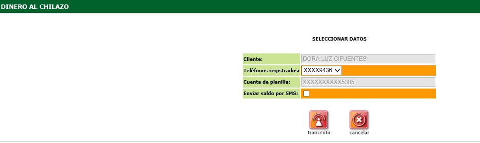 3. Posterior a la validación de datos, visualizará la opción para enviar el monto disponible para el servicio de "Dinero al chilazo" por medio de mensaje de texto, validar nombre del cliente, validar número de teléfono registrado en banco, número de cuenta en donde le acreditan el salario, debe seleccionar la opción de enviar saldo si el cliente lo solicita o continuar con la gestión seleccionando "transmitir"
