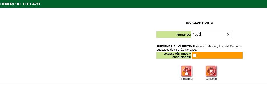 4. Visualizará la pantalla en donde debe ingresar el monto del adelanto de salario que el cliente solicita, informar al cliente de los términos indicados "el monto retirado y la comisión serán debitados de su próximo pago" si el cliente no esta de acuerdo finalizar la transacción o marcar la aceptación para continuar seleccionar la opción "transmitir".