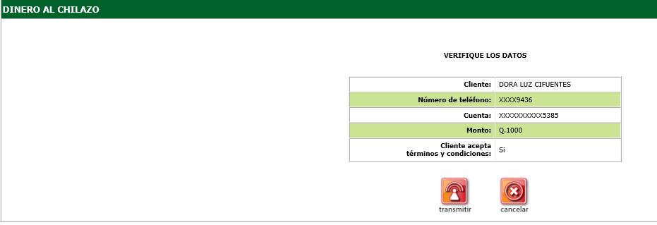 5. En la siguiente pantalla veri ficar el nombre del cliente, número de teléfono, número de cuenta, términos y condiciones aceptadas y seleccionar la opción "transmitir" para solicitar el desembolso .