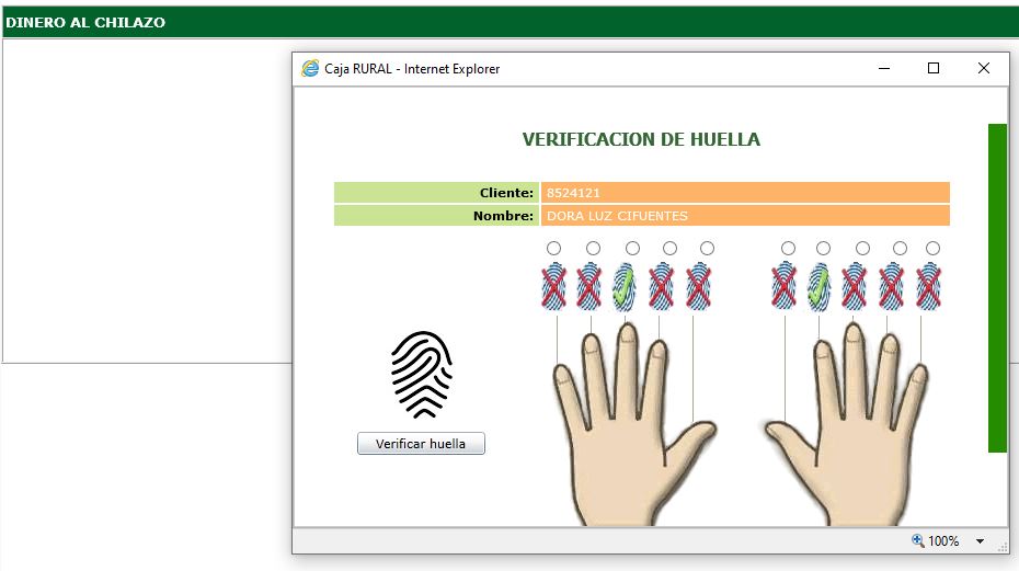 6. El sistema solicitará huella del agente y huella del cliente para validar la solicitud del servicio de adelanto de salario (Dinero al chilazo) para realizar el desembolso al número de cuenta donde le acreditan su salario.