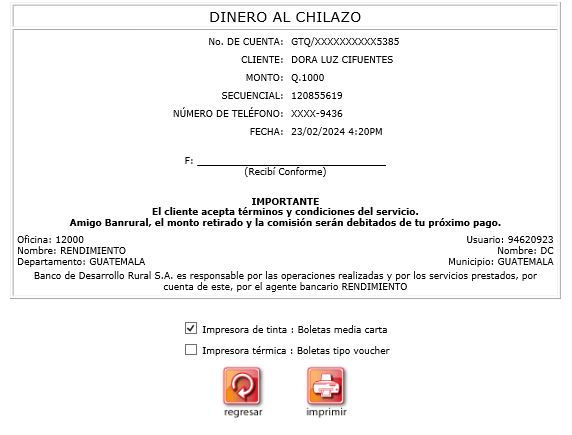 6. El sistema mostrará la boleta por la transacción Dinero al chilazo en Caja Banrural,verificar los datos, seleccionar el tipo de impresora que posea, solicitar la firma al cliente, una boleta se queda para respaldo del agente y la otra boleta se entrega al cliente.