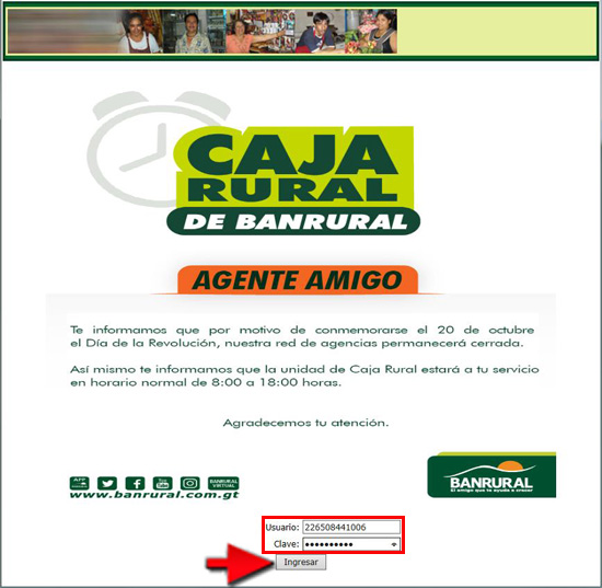 1. Ingresa a la página de Caja Rural con tu "usuario y clave", selecciona el botón "Ingresar".