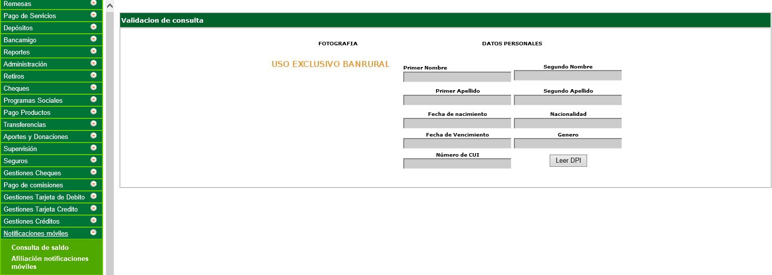2. En el menú principal se encuentra disponible la opción "Notificaciones móviles", seleccionar la opción "Afiliación notificaciones móviles", visualizará la validación de datos del cliente de Banrural la cual podrá realizar con la lectura del DPI o ingresar manualmente el número de documento si este tuviera defectos en el plástico o problemas con el lector de huella