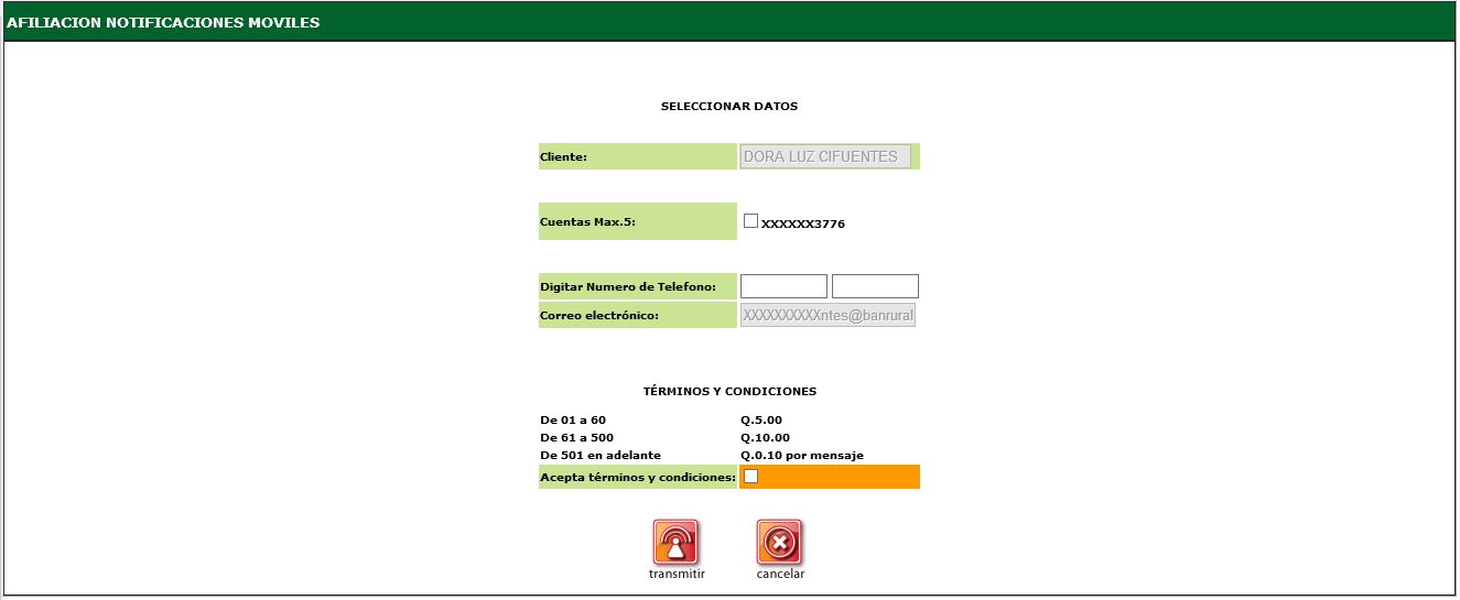 3. Posterior a la validación de datos visualizará la pantalla por Afiliación a Notificaciones móviles, verificar el nombre del cliente, seleccionar las cuentas que el cliente indique (máximo 5 cuentas por gestión) solicitar el número de teléfono para recibir las notificaciones de las cuentas seleccionadas, validar correo electrónico, leer al cliente los términos y condiciones por costo y rango de mensajes, seleccionar la opción de aceptación de términos para seleccionar "transmitir"