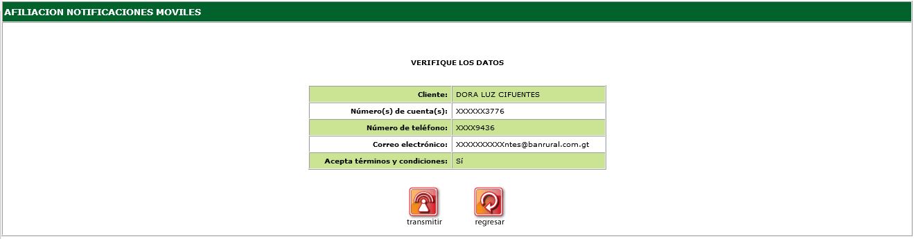 4. En la siguiente pantalla visualizará los datos para confirmar la Afiliación a notificaciones móviles, verificar nombre del cliente, números de cuenta seleccionados, número de teléfono, correo electrónico indicados por el cliente, si los datos son correctos seleccionar "transmitir".