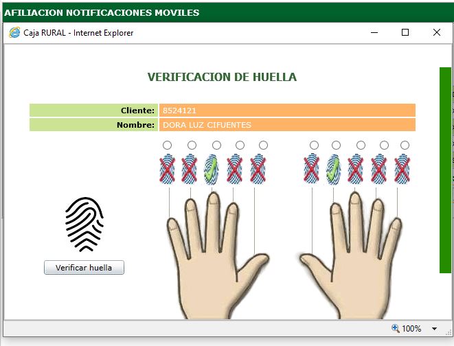 5. El sistema solicitará la huella del agente bancario para validar la solicitud, posteriormente la huella del cliente para la aprobación, de la Afiliación a Notificaciones móviles.