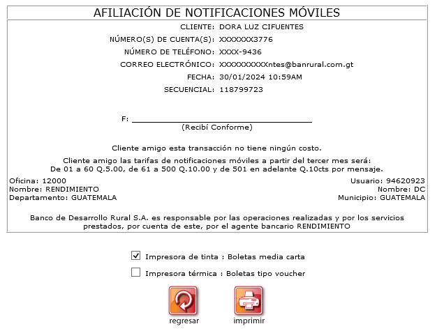 1. Ahora en el módulo del agente Bancario de Caja Banrural nuestros clientes podrán afiliar al número de teléfono que tienen registrado en banco la recepción de mensajes con información sobre sus cuentas de ahorro y monetario por medio de la siguiente transacción: