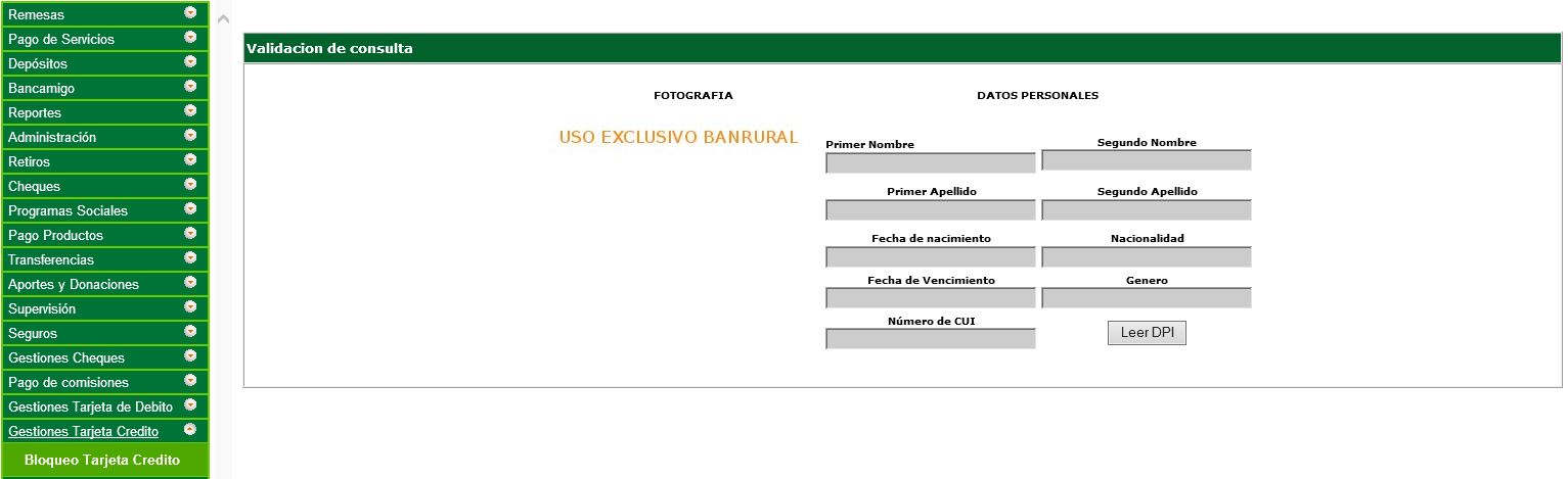 2. En el menú principal ahora se encuentra disponible la opción "Gestiones tarjeta de crédito", en la cual encontrará la opción "Bloqueo tarjeta Crédito", visualizará la validación de datos del cliente de Banrural, realizar la lectura del DPI ó ingresar manualmente el número de documento si este tuviera defectos en el plástico y problemas con el lector de huella