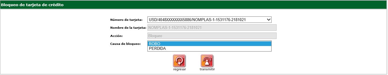 4. El sistema mostrará la pantalla de confirmación de datos para validar el número de tarjeta que se desesa bloquear, acción, causa de bloqueo, si algún dato es incorrecto regresar a la pantalla anterior, si todos los datos son correctos seleccionar "transmitir".