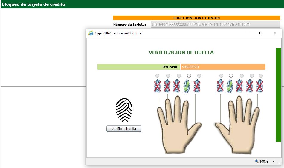 5. Al transmitir el bloqueo de tarjeta de crédito, el sistema solicitarára las huellas del agente bancario y del titular de la tarjeta para finalizar el bloqueo, seleccionar "transmitir"