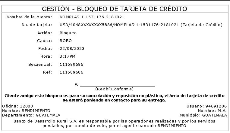 6. El sistema mostrará la boleta por la gestión,de bloqueo de tarjeta de crédito,verificar que los datos sean correctos, seleccionar el tipo de impresora que posea, solicitar la firma al cliente, una boleta se queda para respaldo del agente y la otra boleta se entrega al cliente.