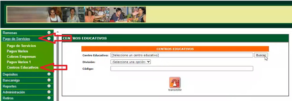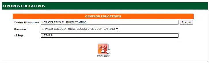 3. Se abrirá una ventana para el ingreso de datos. En el campo División, elija el tipo de pago que desee realizar. En el campo "Código", ingrese el código del cliente, o alumno, que desea realizar el pago. Presione el botón "transmitir" para continuar: