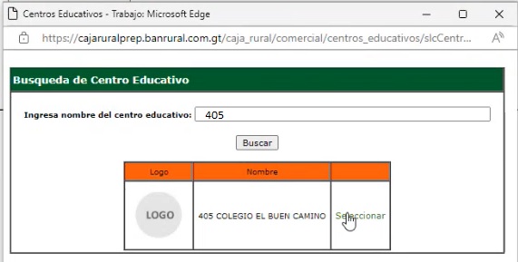 2. En la ventana Búsqueda de Centro Educativo que se abre, ingrese el código o el nombre, parcial o completo, del centro educativo y presione el botón "Buscar". En el listado de los resultados encontrados, presione el enlace "Seleccionar" del Centro Educativo al que desee acreditar el pago: