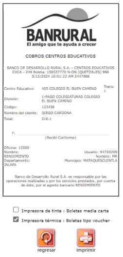 5. Se mostrará la boleta del pago que se colecta a nombre del Centro Educativo. Presione el botón "imprimir", para proceder con la impresión. Entregue una copia de cada boleta al cliente, y una copia para su registro.